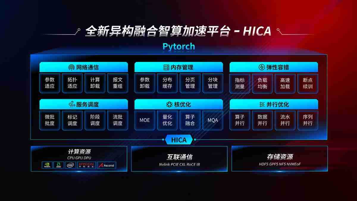 通过自研的服务层、、、、中间适配层、、、以及调度编排算法,,采用数据并行、、模型并行等多种并行方式,,,把并行计算任务进行有效的分解,,,,使其分别由相应的软件栈和算力资源来承接。。。。当GPU资源变化,,,HICA可以实时动态调度计算子任务并调整模型拓扑和架构,,以充分聚合各种算力资源。。。